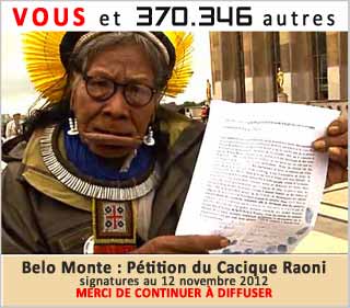 Planète Amazone soutient les peuples d'Amazonie dans leurs combats contre la déforestation et les projets de grandes centrales hydroélectriques qui la favorisent. Nous relayons en Europe la lutte contre la construction du barrage de Belo Monte sur le fleuve Xingu (l'un des 60 barrages prévus à court terme sur les affluents de l’Amazone). La pétition officielle du Cacique Raoni contre Belo Monte, que nous administrons (plus de 360 000 signatures à ce jour) est le tissu d'un mouvement qui ne cesse de prendre de l'ampleur. VOTRE MOBILISATION ouvre ainsi aux peuples d'Amazonie la porte des décideurs et responsables politiques. Pour continuer leur travail et assurer le fonctionnement de Planète Amazone, nos bénévoles ont besoin de votre soutien financier. Celui-ci nous permettra notamment de concrétiser les objectifs et projets suivants : - missions de lobbying politique, rencontres avec des instances internationales, des partenaires potentiels et autres décideurs suceptibles de faire bouger les lignes, impliquant des déplacements en France et à l'étranger ________________ Aujourd'hui, les populations indigènes du Xingu ne comptent plus sur la justice de leur pays pour faire respecter leurs droits. Grâce à vos dons, à votre soutien constant, nous pouvons continuer à effectuer le relai en Europe et dans le monde des combats du Cacique Raoni, notamment par le biais du site www.raoni.com, que nous faisons vivre en quatre langues actives (7 pour la pétition), de nos 4 pages Facebook, de notre compte Twitter. Il est grand temps de joindre nos forces si nous voulons espérer inverser la tendance de l'avenir sombre qui se dessine à court terme en Amazonie et pour la planète.